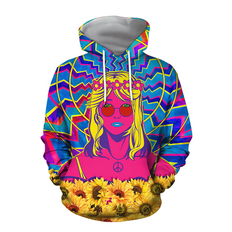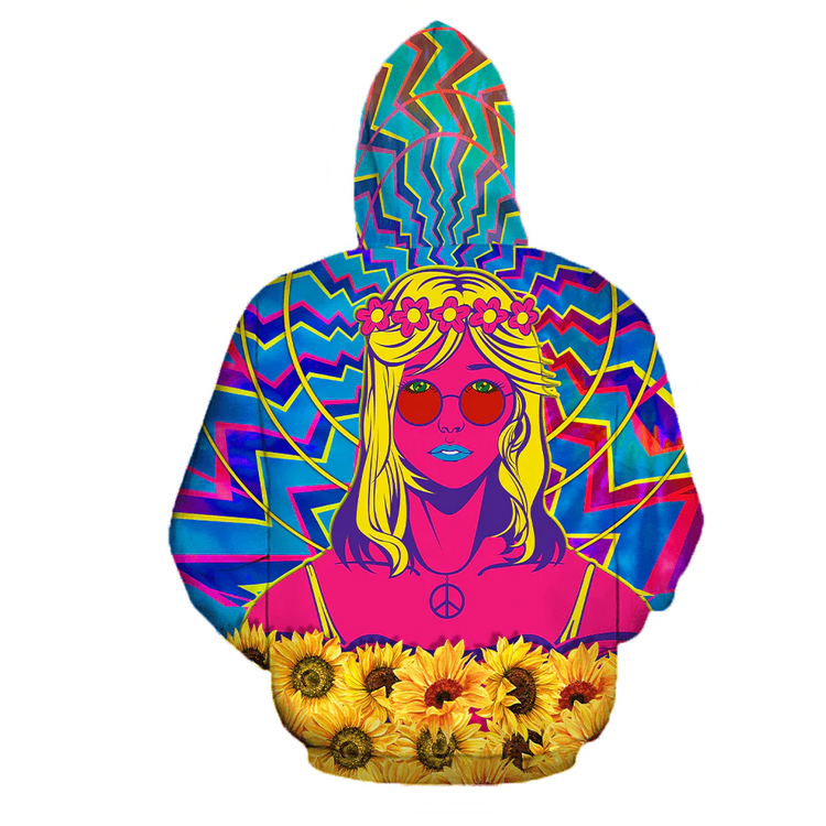 Hippie Girl With Sunflower Peace Sign All Over Printed Unisex Hoodie, Women Hippie Hoodie Hippie Gift For Her