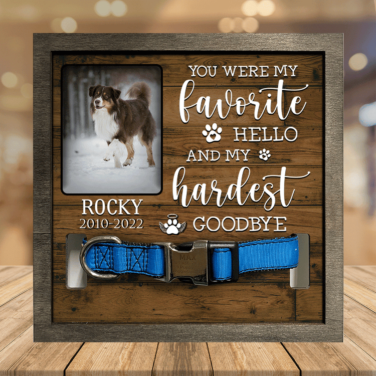 - Losing a pet is never easy. Having a beautiful keepsake to look at every day can help ease that grief a little bit. Customized with your pet's name and a spot for your favorite picture of them. The sign features a space to display their collar.