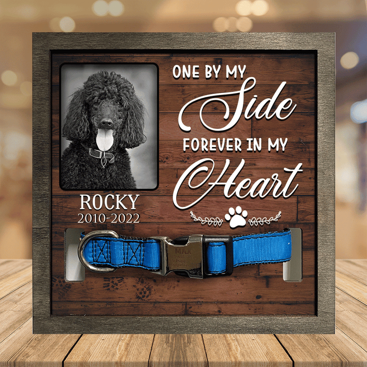 - Losing a pet is never easy. Having a beautiful keepsake to look at every day can help ease that grief a little bit. Customized with your pet's name and a spot for your favorite picture of them. The sign features a space to display their collar.